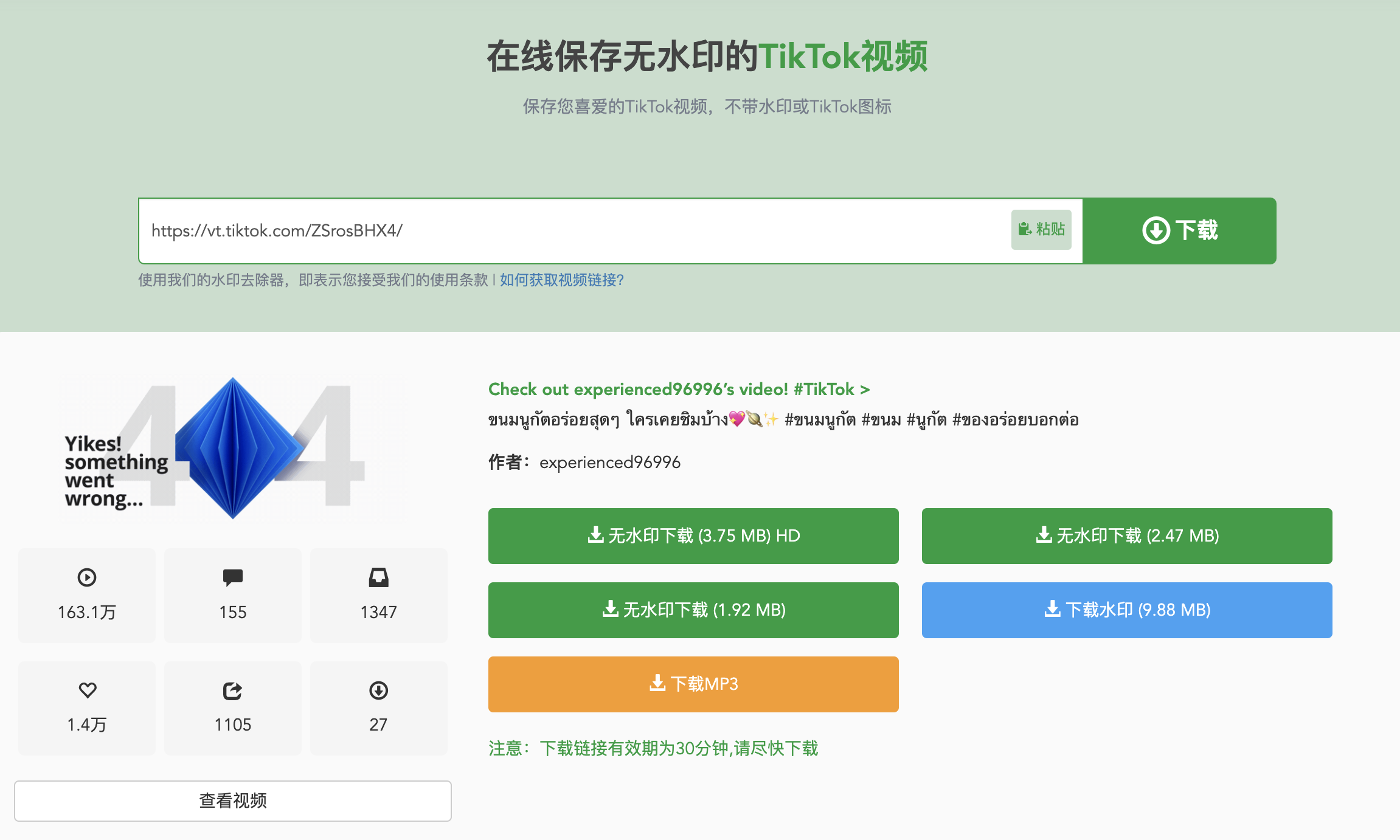 Step 4:Once the download address is successfully displayed, you can select the version of the video you want, and then click the"Download"button next to it, and you will see several video options. The video downloader allows you to download TikTok videos without watermarks (MP4), watermarks (MP4), and MP3 formats.