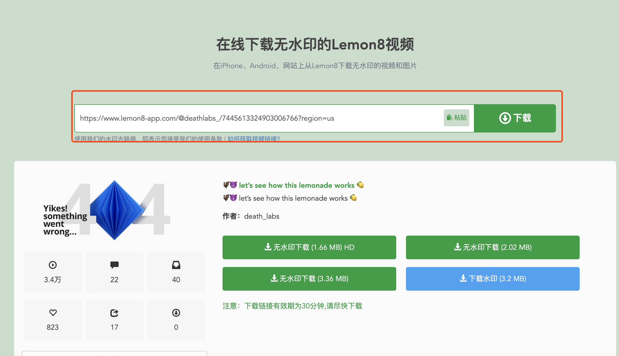 4、转到当前网站页面,将复制的Lemon8链接粘贴到搜索框中,然后按下载按钮。